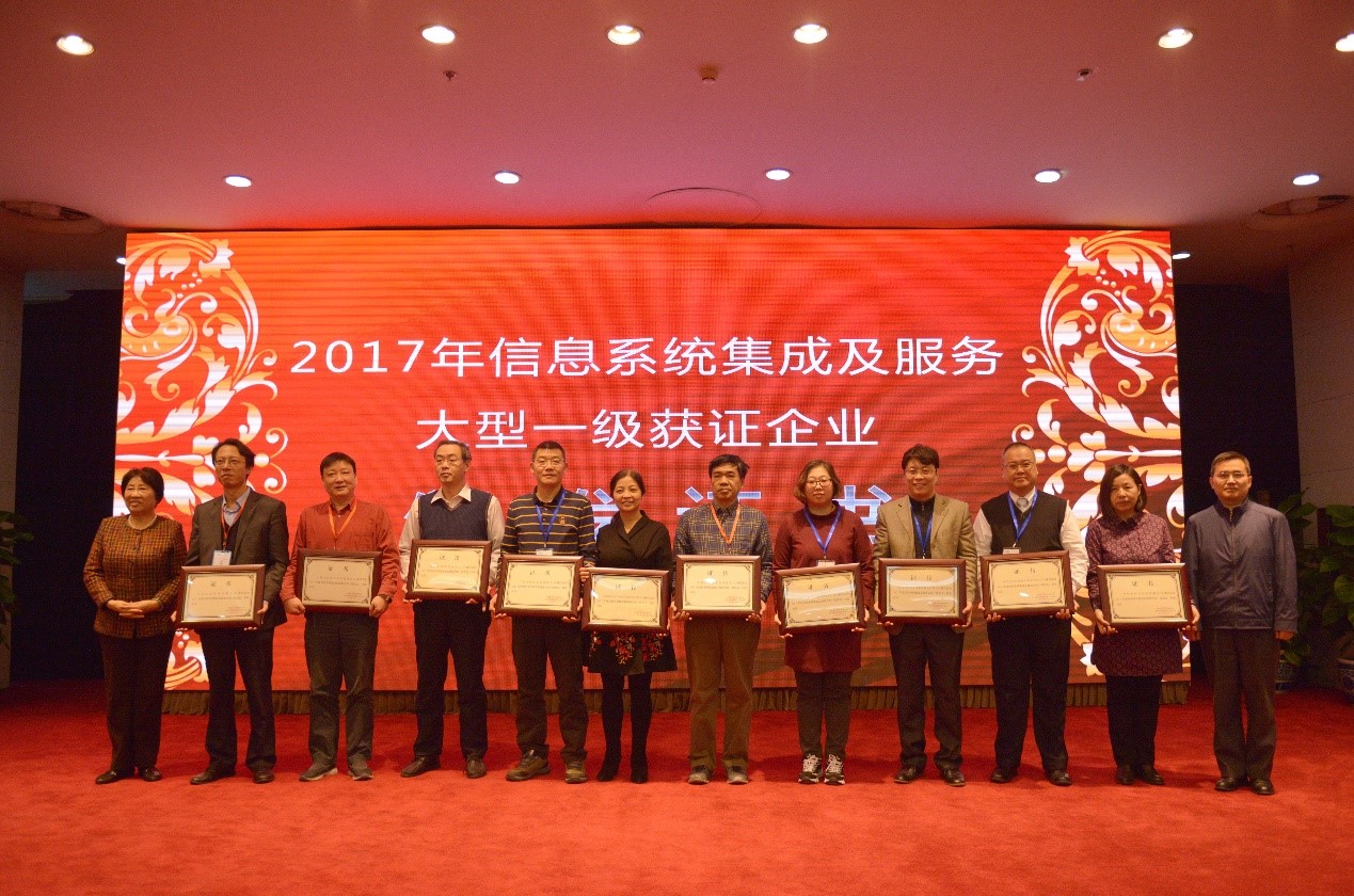 2017年12月13日, 2017中國(guó)信息系統(tǒng)集成及服務(wù)行業(yè)年會(huì)在北京召開。中國(guó)電子信息行業(yè)聯(lián)合會(huì)在會(huì)上公布了“2017年信息系統(tǒng)集成及服務(wù)大型一級(jí)企業(yè)”證書獲獎(jiǎng)單位名單并頒發(fā)證書,億陽信通股份有限公司名列其中!