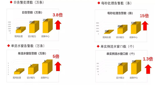 故障中心在硬件資源減少 50%的同時(shí),整體處理能力提升 6 倍以上,支持每日活動(dòng)告警 2000 萬條,每秒告警處理 3200 條,單實(shí)例流水窗 200 個(gè),單流水窗 5 萬條的處理能力,滿足節(jié)假日保障,重大活動(dòng),告警風(fēng)暴等常用場(chǎng)景的使用。支持彈性伸縮擴(kuò)展,滿足網(wǎng)絡(luò)變化和突發(fā)情況下對(duì)系統(tǒng)性能處理能力的快速擴(kuò)容要求。