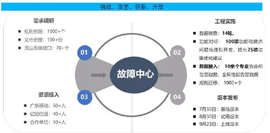 2021 年 9 月 23 日廣東移動(dòng)故障中心在全國(guó)率先并行上線, 助力中國(guó)移動(dòng)廣東公司“ 三大戰(zhàn)役”業(yè)務(wù)戰(zhàn)略,標(biāo)志著廣東移動(dòng)智慧中臺(tái)的建設(shè)邁出堅(jiān)實(shí)的一步, 網(wǎng)絡(luò)數(shù)智化運(yùn)營(yíng)邁向新的高度。