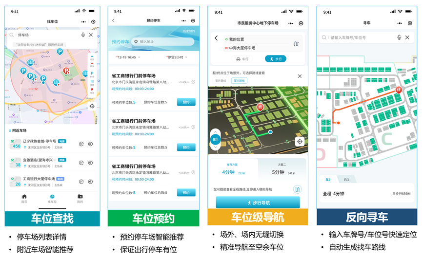 ·反向?qū)ぼ?/B>:停車后,系統(tǒng)自動記錄車位信息,通過APP或微信小程序自動生成找車路線,節(jié)約找車時間。