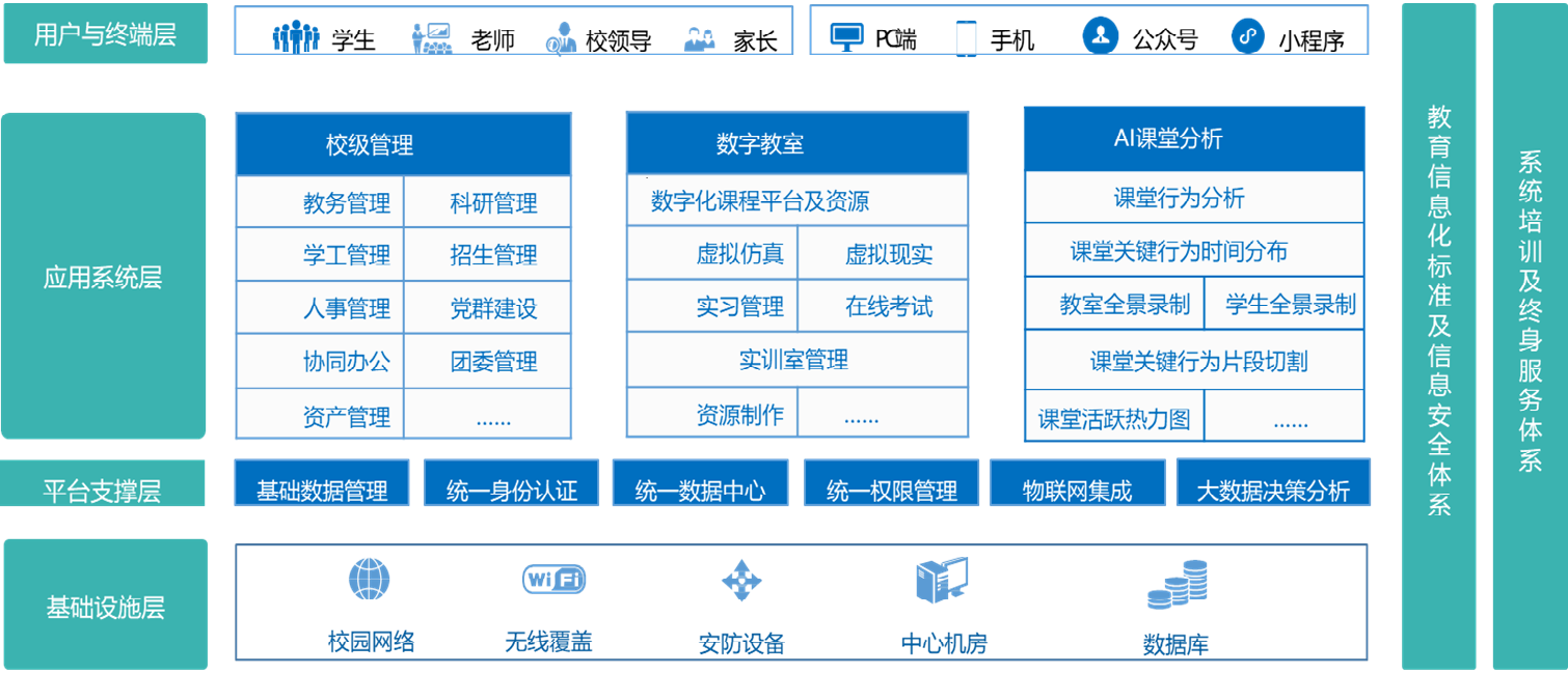 本項目涵蓋校級管理平臺、數(shù)字教室平臺以及 AI 課堂分析系統(tǒng)等重要組成部分。其中校級管理平臺將教務(wù)、科研、學(xué)工、招生、人事、黨建以及資產(chǎn)等多個重要領(lǐng)域的管理功能有機融合,構(gòu)建成一個綜合性的管理體系,實現(xiàn)了學(xué)校資源的集中化管理;數(shù)字教室平臺提供督導(dǎo)巡課、數(shù)字化課堂、虛擬課堂、名師課堂、在線考試、實訓(xùn)室管理、資源制作等功能,可在不同終端進行課堂重現(xiàn),打破時空限制形成以學(xué)生為主體的全學(xué)習(xí)環(huán)境;AI課堂分析系統(tǒng)通過實時監(jiān)測課堂教學(xué)行為、全面分析教學(xué)數(shù)據(jù)、精準(zhǔn)評估教學(xué)效果,并智能生成改進建議以助力教學(xué)優(yōu)化。