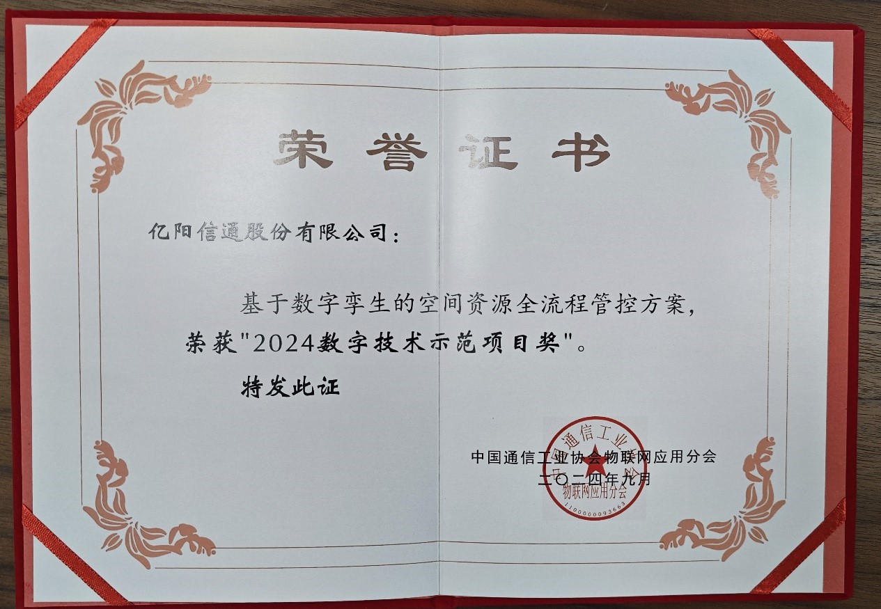 近日,由中國(guó)通信工業(yè)協(xié)會(huì)物聯(lián)網(wǎng)應(yīng)用分會(huì)隆重舉辦的第十四屆智慧城市與智能經(jīng)濟(jì)博覽會(huì)在寧波市圓滿召開(kāi)。在此次盛會(huì)中,億陽(yáng)信通作為數(shù)字技術(shù)應(yīng)用領(lǐng)域的領(lǐng)軍企業(yè),榮幸受邀參展。公司憑借其創(chuàng)新力作“基于數(shù)字孿生技術(shù)的空間資源全生命周期管理與控制解決方案”,在眾多參展項(xiàng)目中脫穎而出,榮膺“2024年度數(shù)字技術(shù)示范項(xiàng)目獎(jiǎng)”,彰顯了億陽(yáng)信通在推動(dòng)數(shù)字技術(shù)創(chuàng)新與應(yīng)用方面的卓越成就與貢獻(xiàn)。