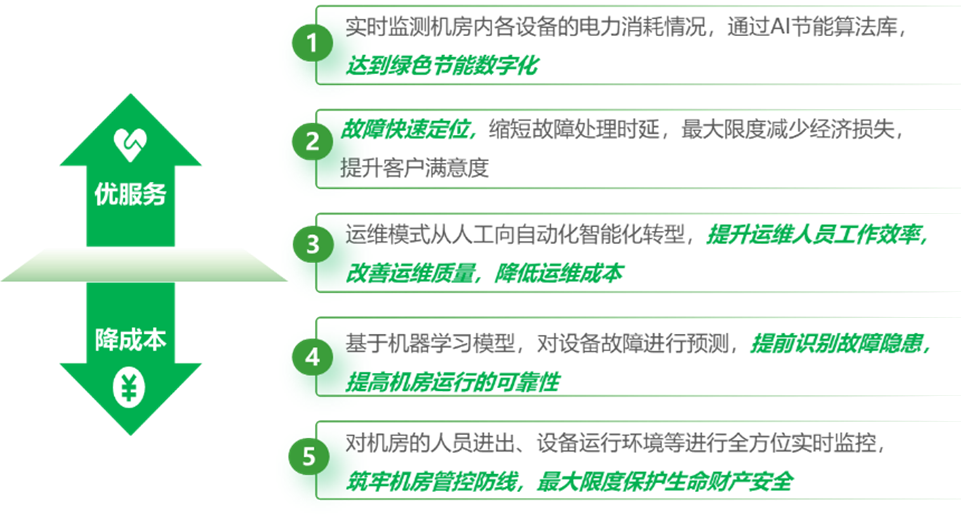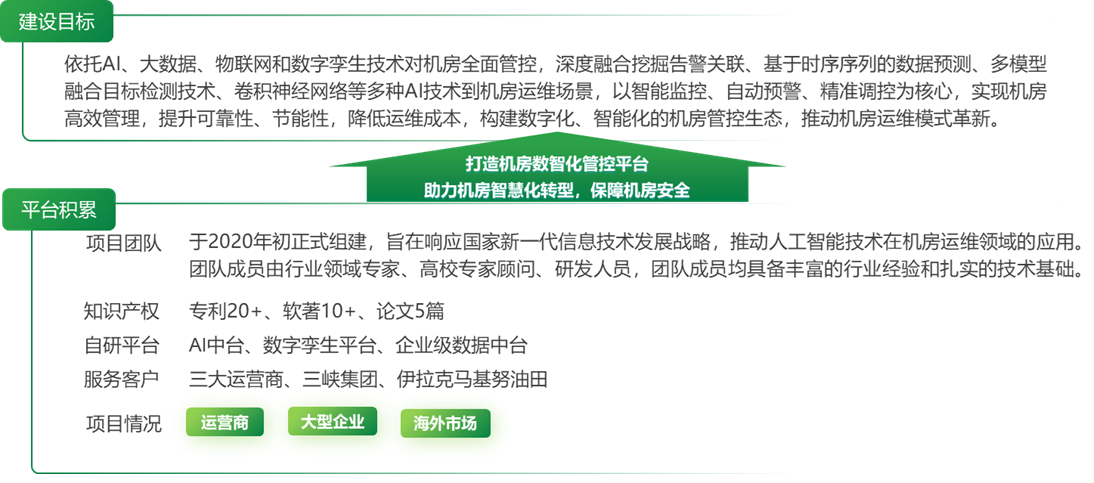 平臺(tái)依托AI、大數(shù)據(jù)、物聯(lián)網(wǎng)和數(shù)字孿生技術(shù)對(duì)機(jī)房全面管控,深度融合挖掘告警關(guān)聯(lián)、基于時(shí)序序列的數(shù)據(jù)預(yù)測、多模型融合目標(biāo)檢測技術(shù)、卷積神經(jīng)網(wǎng)絡(luò)等多種AI技術(shù)到機(jī)房運(yùn)維場景,以智能監(jiān)控、自動(dòng)預(yù)警、精準(zhǔn)調(diào)控為核心,實(shí)現(xiàn)機(jī)房高效管理,提升可靠性、節(jié)能性,降低運(yùn)維成本,構(gòu)建數(shù)字化、智能化的機(jī)房管控生態(tài),推動(dòng)機(jī)房運(yùn)維模式革新。